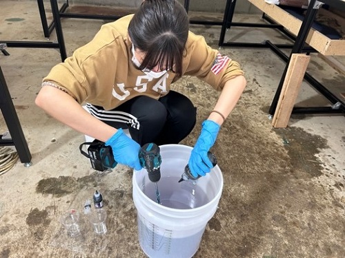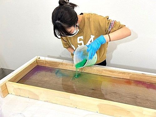 造形学部環境デザインコース4年の益村凜華さんは、RESIN SPACE様のご協力により、卒業制作でレジンテーブルに取り組んでいます。10月30日(水曜日)にはスタジオに伺い、自作の木枠に色付けしたレジン液を流し込む作業を行いました。