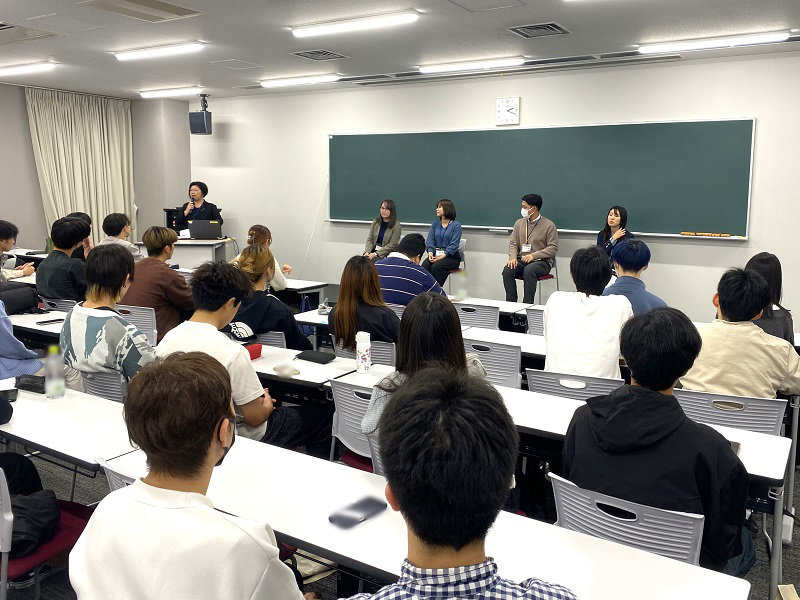 第2部では、IT企業に勤務する本学のOB・OGのパネルディスカッションが行われました。『IT業界で働く先輩に話を聞こう』と題し、同協会の人材育成推進部会に所属する(株)エル・ティー・エス、(株)静岡情報処理センター(株)建設システム、(株)ユニテック に勤務する本学のOB・OGのそれぞれからIT企業における現在の仕事、IT企業への興味を持った理由、企業選択の理由等の紹介があり、ゼミ生との質疑応答が行われました。