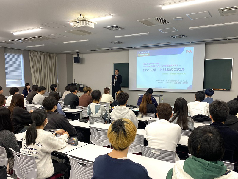 第1部は、独立行政法人情報処理推進機構(IPA)デジタル人材センター国家資格・試験部主幹の土屋 滋様によるセミナーが開催されました。『社会ではすでに常識~大学生が学んでおくべき情報活用スキル ITパスポート試験のご紹介』と題して、なぜ今ITスキルを身につけることが求められるのかについて、これから目指す未来社会、AI活用、DX推進、情報セキュリテイの解説があり、あわせて情報処理義従者試験の全体像とITパスポート試験の概要や企業の活用事例の紹介がありました。