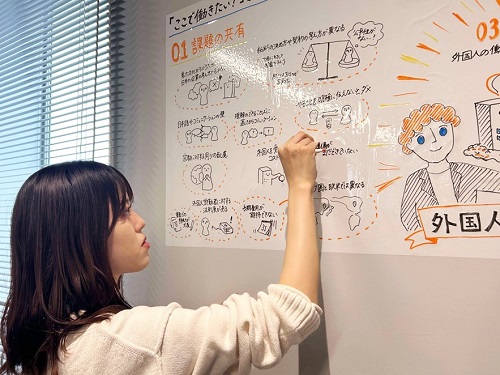 学生たちは2週間ほどをかけて組織運営やキャリア形成について文献や論文を読みこみ、経営者たちの言葉が理解できるように準備を重ねました。また、グラフィックレコーディングの技術は現代のデザイナーの必須技能であることから、UXデザインの授業や研究会でも自主的なトレーニングを重ねており、こうした知識と技術を基に現場に望んでいます。こうしてビジネスの現場でデザインの知恵を使う活動を、学生たちは大いに楽しむことができました。