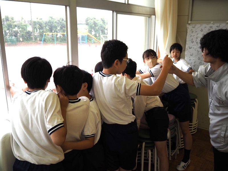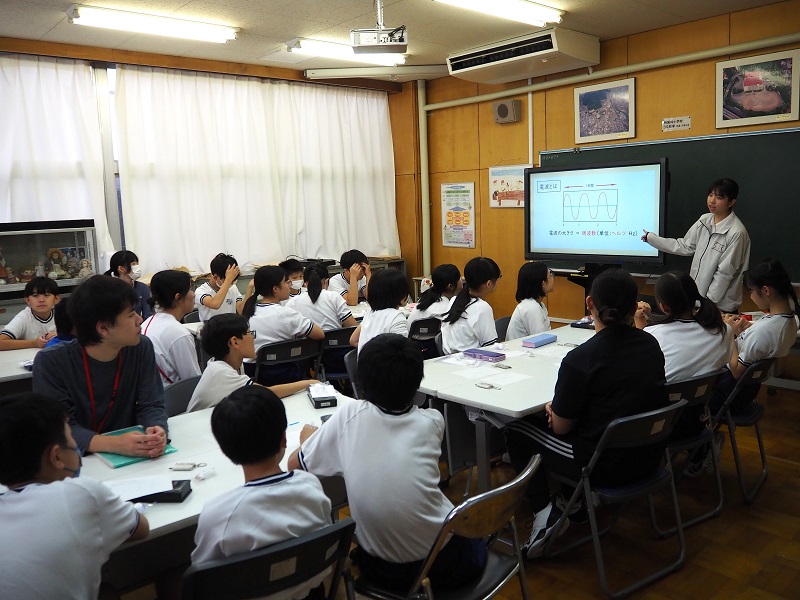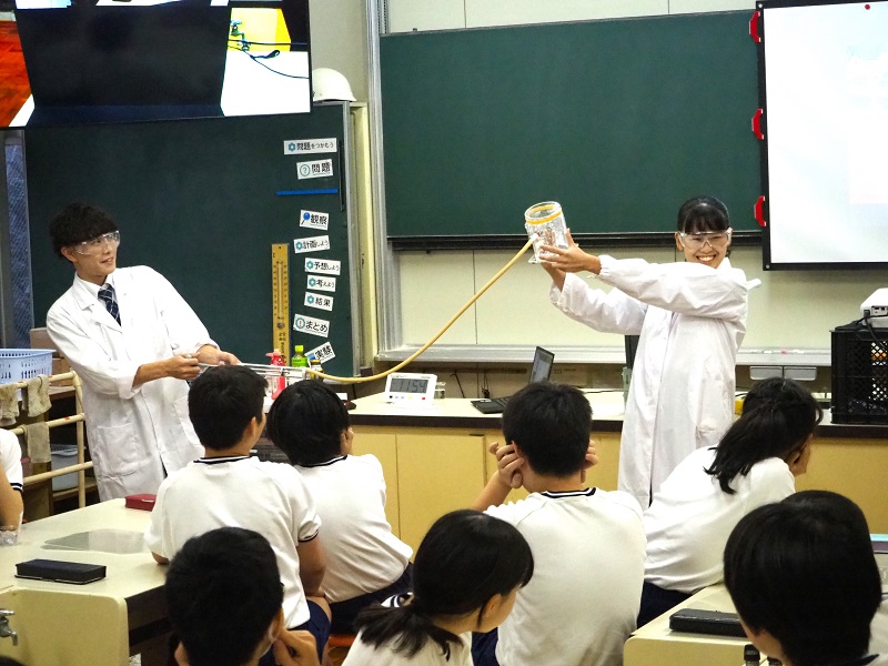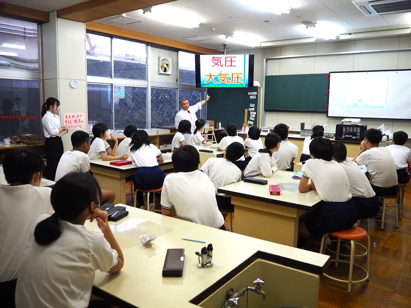 当日は、理科専攻の学生補助スタッフも参加して、『大気圧』『電波』『紫外線』の3つをテーマに各1時間ずつの授業を実践しました。
