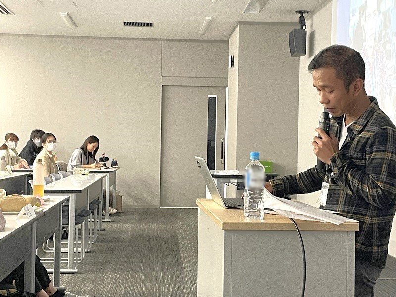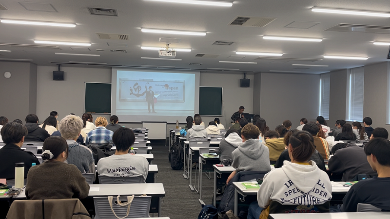 アイディル氏は、技能実習生として来日し日本で過ごした後、2024年から特定技能の在留資格にて働いています。来日後は毎週日曜日に公益財団法人浜松国際交流協会が管轄する、浜松市天竜区の日本語教室にて日本語を学んできました。令和元年より月に一回常葉大学生がオンラインにて日本語を教える機会をいただいており、Show&Tellなどを通して相互理解を深めるとともに、大学生が引き出した学習者の生活や思い、夢、好きなこと・場所・人などを文章化し、スピーチに繋げる活動を重ねています。スピーチは浜松市の会場にて多くの一般市民を前に発表されたり学習者と来場者の交流の場であるポスター発表に繋げたりしています。これまで市民と学習者の接点を創出してきましたが、本学においては、多文化共生意識涵養が天竜日本語教室に参与した学生に留まっていました。そこで、昨年度から学習者の一人アイディル氏にゲストスピーカーとして外国語学部の授業に登壇いただいています。