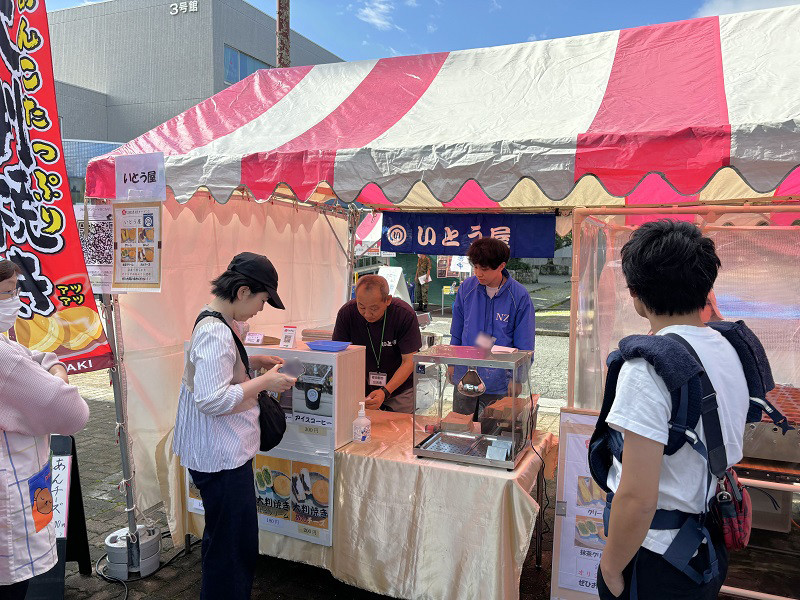 昨年度に引き続き、経営学部経営学科中津川智美ゼミの2年生7名が運営に協力しました。事前に店舗紹介ポスターを制作し、それを持ちながら来場者に声をかけることや、ステージで各店舗の紹介を行うことで売上に貢献しました。また、お店に入って出店者の販売をサポートすることで地域の方々との交流をさらに深めることができました。