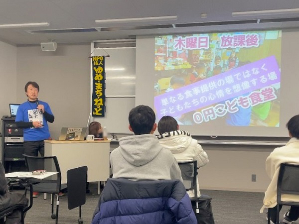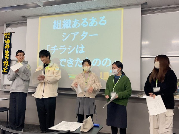 講師は、NPO法人ゆめ・まち・ねっと代表の渡部達也氏で、対象プログラムである学修ピアサポーター・大学祭実行委員会・トコハ広報大使・オープンキャンパス学生スタッフ・図書館サポーター等の学生16人が参加しました。前半は、子どもの頃の夢の理由の中に将来目標のヒントがあることや最初の一歩は何をどうやるかではなくなぜやるのかが大切であることをワークを通じて学びました。後半は、ゆめ・まち・ねっとが行政ではできない事業に挑戦して継続している事例とその理由を紹介した上で、組織でありがちなトラブルを寸劇を通じて実践的に学び合いました。