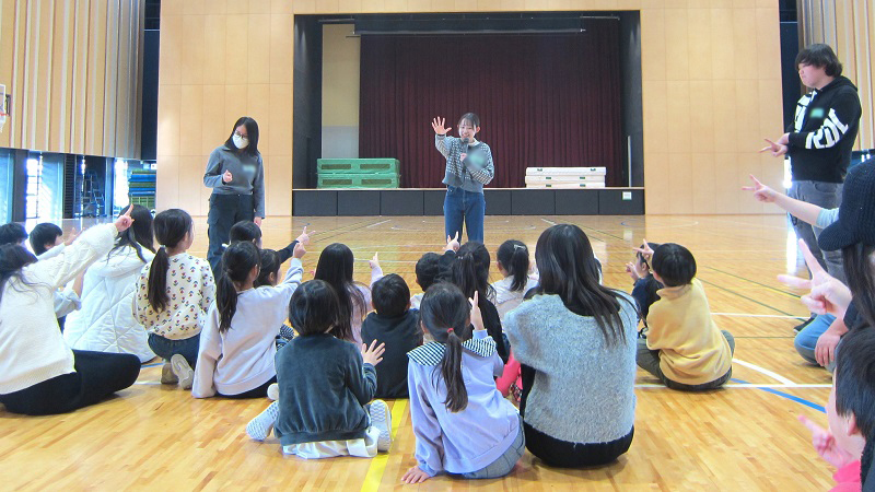 今年度の『キッズ・コミュニケーション』の授業では、年間を通して、今回のようなアリーナ(体育館)での活動を4回、近隣のこども園での活動を4回行いました。回数を重ねる毎に、子ども達との接し方の技術が向上していくところを目にすることができました。