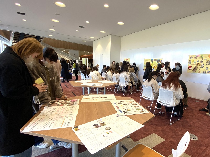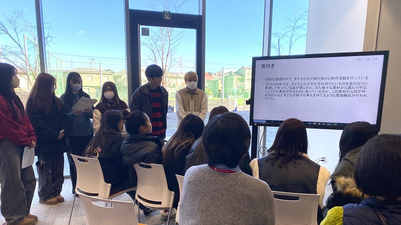 『学びの発表会』はその集大成として、自らの学びを発表したり、他者の学びを聴いたりすることで、保育の学びを仲間同士で深めるために開催しました。発表会では、一生懸命に人前で発表をしたり、他人の発表に耳を傾けたり、互いに意見を交換したりする学生の姿などがたくさん見られました。