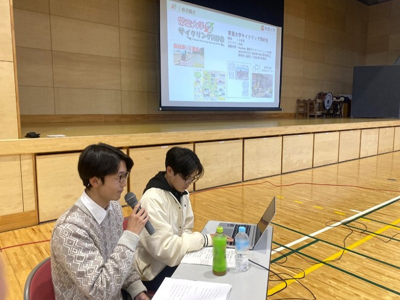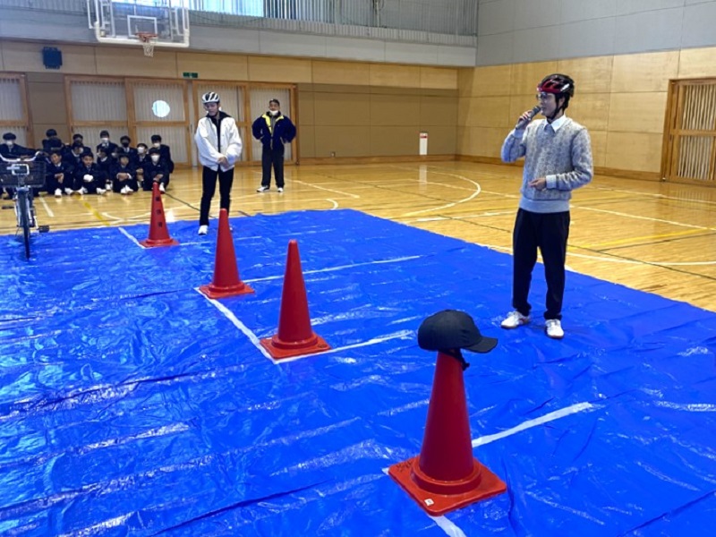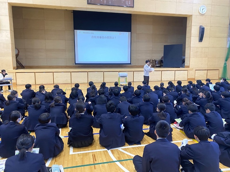 当日は本学経営学部と社会環境学部の学生を中心に、中学生の自転車事故の原因例や特徴を紹介した後、自転車事故の予防策について実演を交えながら説明されました。