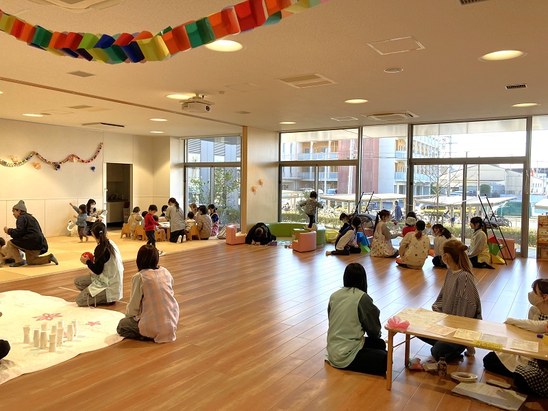 短大保育科の2年生『乳児保育演習』の授業の成果を生かして、雪や豆まきなど季節を意識したあそびや、凧・けん玉・福笑いなどの伝統的なあそび、積み木やボーリングなど身体を動かすあそびなど、0・1・2歳児の子ども達が楽しめるようにと考えて企画をしてきました。学生たちにとっては短大2年間で身につけた知識や体験の集大成です。