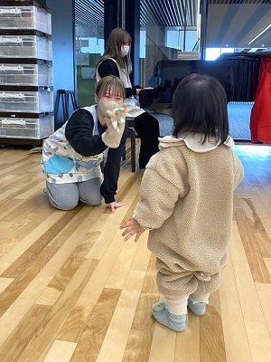 当日は、主に1・2歳児のお子さんたちが遊びに来てくださり、何度も何度も繰り返し楽しんだり、子ども達同士で関わったり、緊張しながらお姉さん達と遊んだりと、学生たちの予想を超えた多様な姿も見せてくれました。臨機応変に対応する卒業間近な学生たちを見て、春から保育現場で子どもたちと過ごす姿をイメージすることができました。