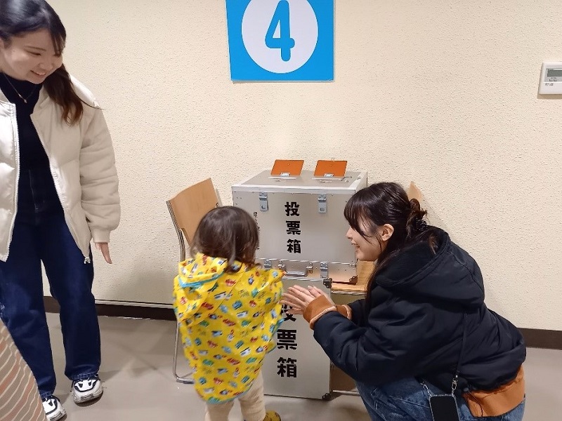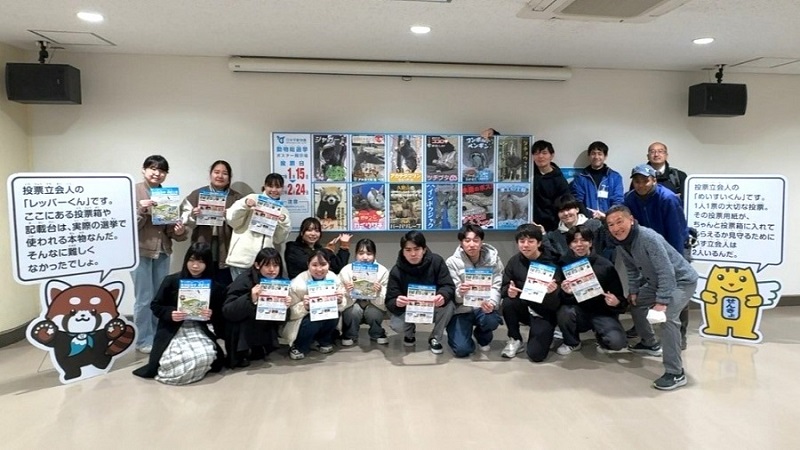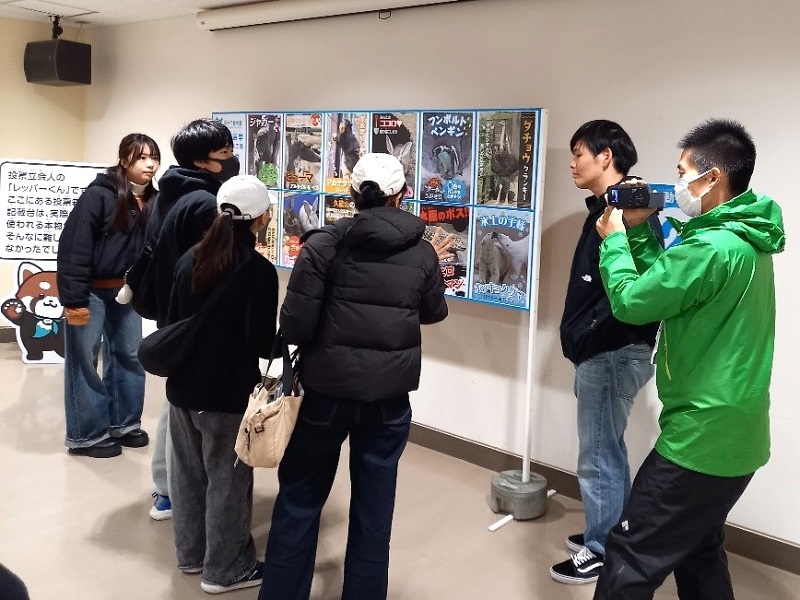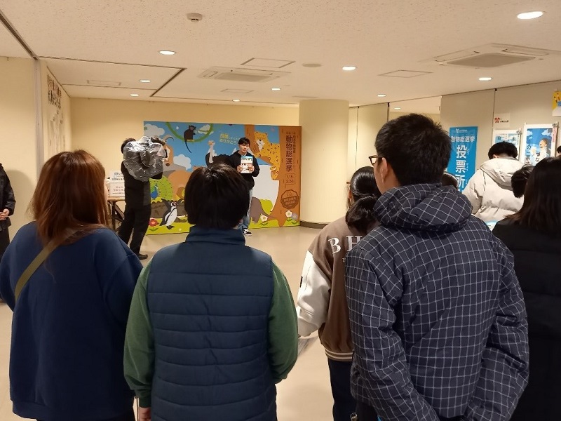 当日は冷たい雨の降る中、動物園入口で来園したお客様に投票用紙と自作の選挙公報を配布したり、投票所となっているビジターセンターでフォトスポットの案内や投票への誘導・案内をするなど、積極的にお客様と交流しました。また、投票所内に設置されているフォトスポットにおいて“推し動物”を“イチオシ”する選挙演説を行い、投票の呼びかけも行いました。