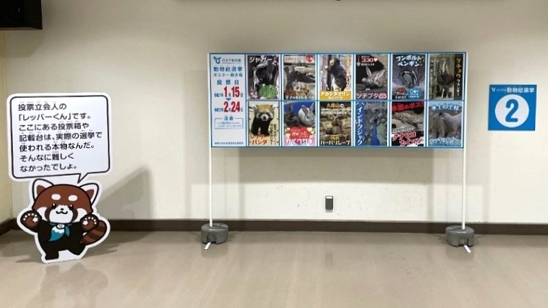 動物総選挙は2月24日(月曜日)までとなっております。是非この機会に日本平動物園に足をお運びいただき、学生制作のポスターと本格的な投票所をご覧いただきながら、あなたのイチオシに一票を投じてください。(1月末現在、約2週間で1万票を上回る投票がありました。)