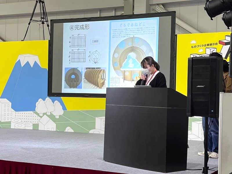 2月7日(金曜日)、ふじさんめっせ(富士市)において『ものづくり力交流フェア2025』が開催され、造形学部の環境デザインコース4年の伊藤稚那さん、アート表現コース4年の松本伊吹さんと環境デザインコース3年の増田さんと村本さんが登壇し、発表を行いました。