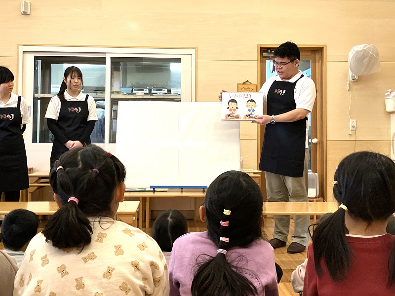 1月29日(水曜日)、近隣の保育園『れんりの子』にて健康プロデュース学部健康栄養学科の有志で構成する『トコへる』の学生3名が園児24名を対象に食育講座を開催しました。
