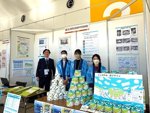 富士地域再生家庭紙利用促進協議会のブースでは、『プロジェクトの目的』『デザイン思考とは』『デザイン思考実践のメリット』『再生紙の生産工程』ワークショップの成果である『グラフィックレコーディング』『工場見学・活動成果のシーン』をまとめた『パネル展示』を行い、『メイキング動画』を配信しました。あわせて、できあがった新しいデザインで包装した『ふじのかみ』トイレットペーパーを来場者の方々に配布し、アンケート調査を実施しました。