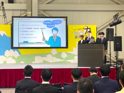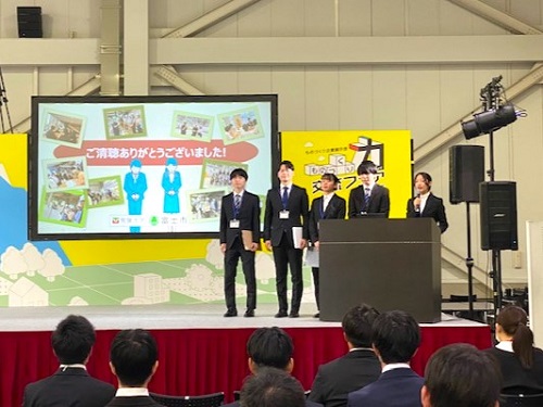午後には、『県内大学による事例発表:産学連携で新たな一歩を』のステージプレゼンテーションのコーナーで、代表の石川巴菜さん、松下友哉さん、上楽紘豊さん、廣野朝哉さん、湯野静菜さんの5名が発表を行いました。