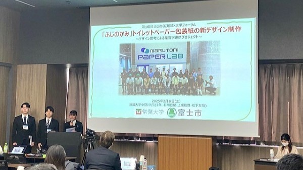 | 本市が提案した『「ふじのかみ」トイレットペーパー包装紙の新デザイン制作』に参画いただき、ありがとうございました。 現代社会に求められる環境配慮は多岐にわたることから、トイレットペーパーの仕様変更に伴う包装紙のデザイン変更では、これまでにない製品の特長や背景を上手くパッケージデザインに落とし込む必要がありました。 今回のプロジェクトでは、デザイン経営の勉強から工場見学、ゼミ内での議論と進めていただき、富士地域で作られる再生家庭紙をうまく表現してデザインにまとめていただきました。 各種イベント等で消費者へのPRに使用することで、富士市地域で生産される再生家庭紙全体の売り上げにつながることや、メーカーのパッケージデザインに良い影響が出ることが期待されます。(富士市役所 産業交流部産業政策課) |