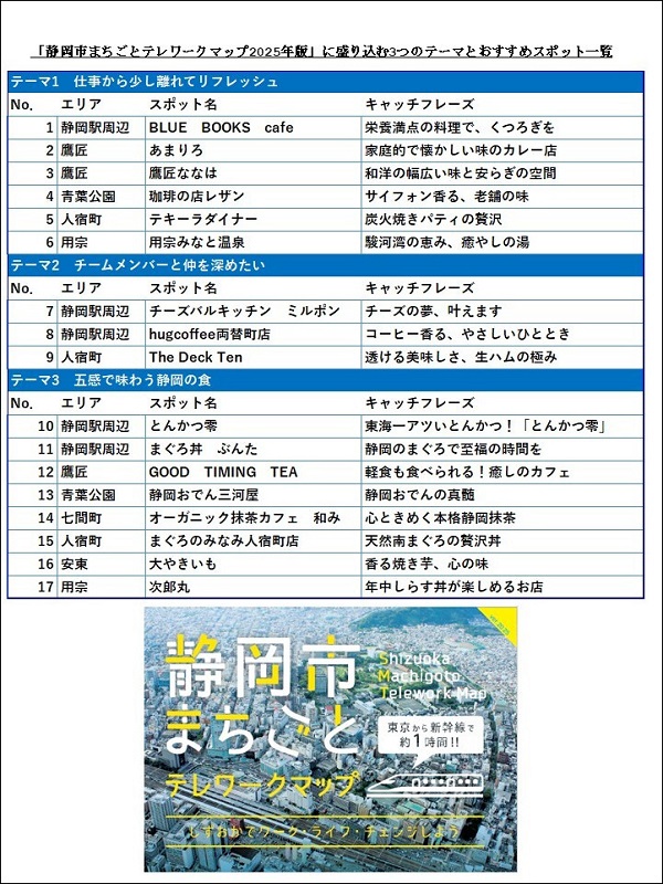 これらの成果を踏まえ、今年度は市内テレワーク施設それぞれの特徴を活かしたアフターコロナの働き方に即した形での利用促進のため、テレワークの需要調査と市内テレワーク施設についての整理および紹介資料の更新を目標として、1.『コロナ禍後のテレワークの需要調査』、2.『静岡市まちごとテレワークマップ2025年版』の企画・制作、3.お試しテレワーク体験事業等で訪れた人々が静岡市をさまざまな観点で楽しめる『3種類のツアープラン』の企画を実施しました。