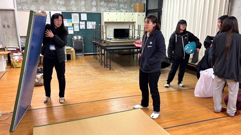 学生らは「人生観が180度変わった」、「同郷の方がいて、地元の話をするととても喜んでくれた」、「家の形があるのに危険だとの判断で自宅に入れないと聞いた」、「復興が進んでいないと感じた」、「避難生活を送っているのにおばあちゃんが元気で自分が元気をもらった」など報告し合いました。また寝袋や畳の上で過ごした一夜を振り返り「眠れなかった」と報告すると、浜松市危機管理課の方は「避難所に来なくても良いように、できるだけ自宅で避難生活ができるよう備えをしてほしい」と話しました。