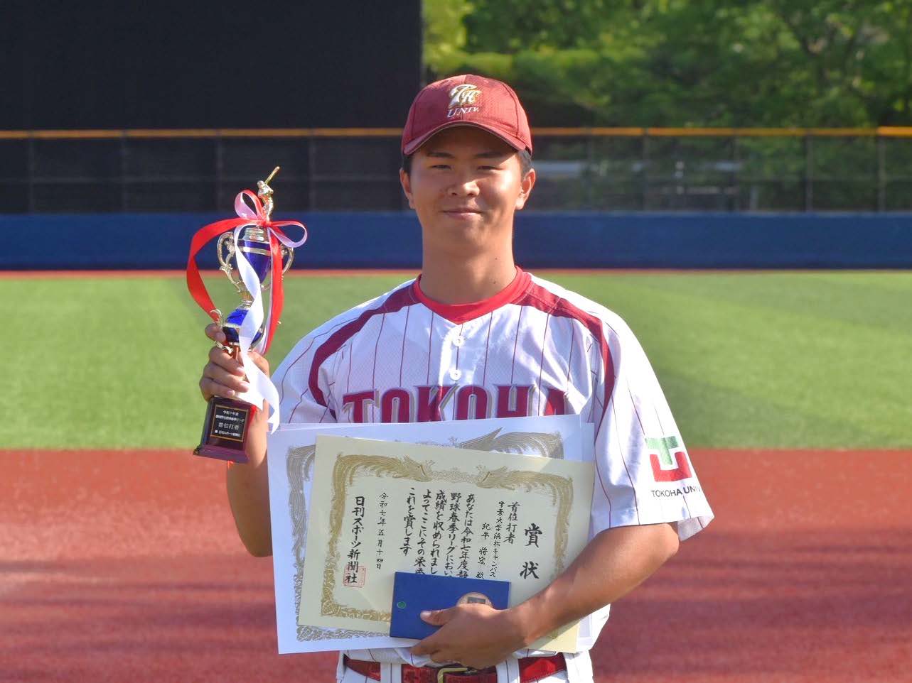 東海地区大学野球連盟静岡学生野球春季リーグ戦(3月29日(土曜日)~5月14日(水曜日))の全日程が終了し、本学浜松キャンパス硬式野球部の紀平将宏選手(健康プロデュース学部健康柔道整復学科4年)が首位打者ならびにベストナイン(一塁手)を受賞しました。