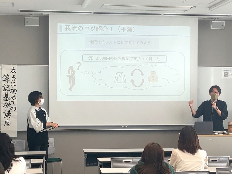 これは、学修ピアサポーターや簿記担当教員と意見交換して、昨年初めて実現したものです。今年は、昨年の学生講師の平澤泰造さん(経営学部3年)に加えて、昨年は受講生だった大倉なるみさん(経営学部2年)も講師になってもらいました。