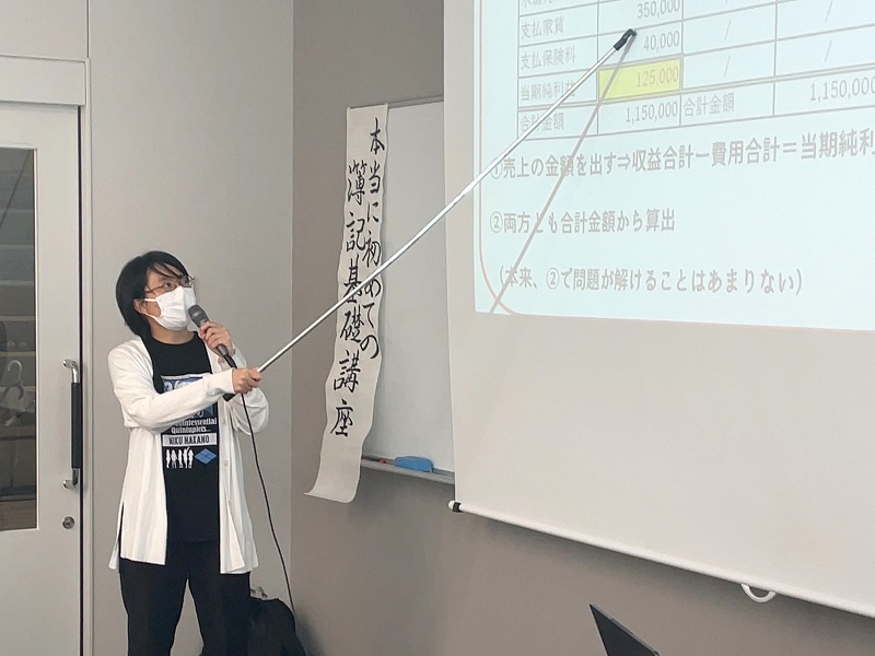 2人は、それぞれ自分流の学び方や理解が難しかった点を紹介した他、日々の仕訳と貸借対照表や損益計算書の作成演習を行いました。多様な学部、学年の学生20人が参加し、「授業でわからなかった部分がわかった」「簿記の考え方に慣れた気がする」「先輩の話を聞いて、簿記の必要性がよくわかったので、資格を取りたいと思った」などの感想がありました。学生講師の2人は、約1か月ほど意見交換して準備する過程で、教える難しさと面白さの両方を学んだそうです。