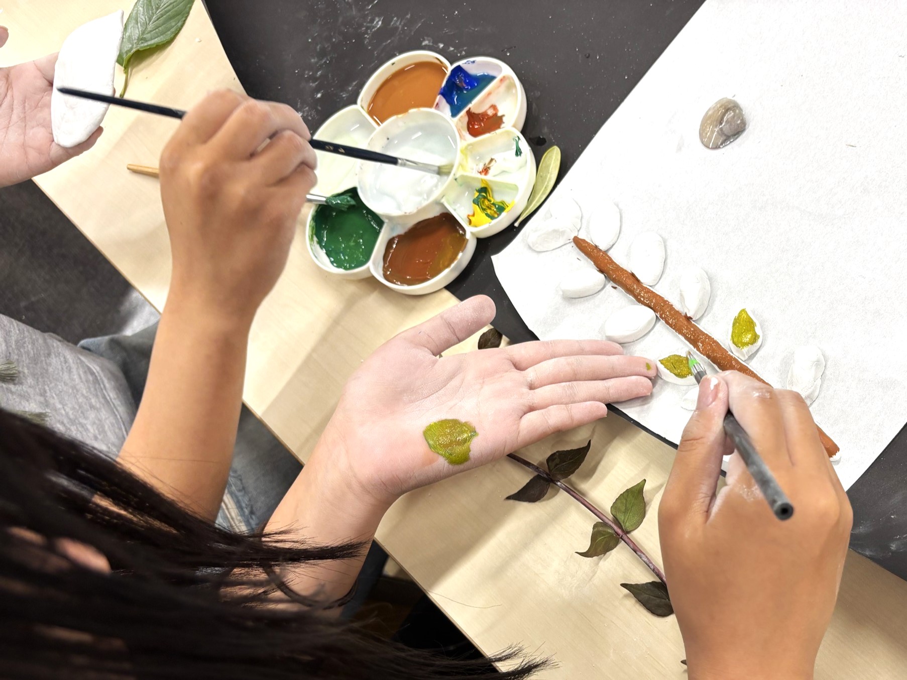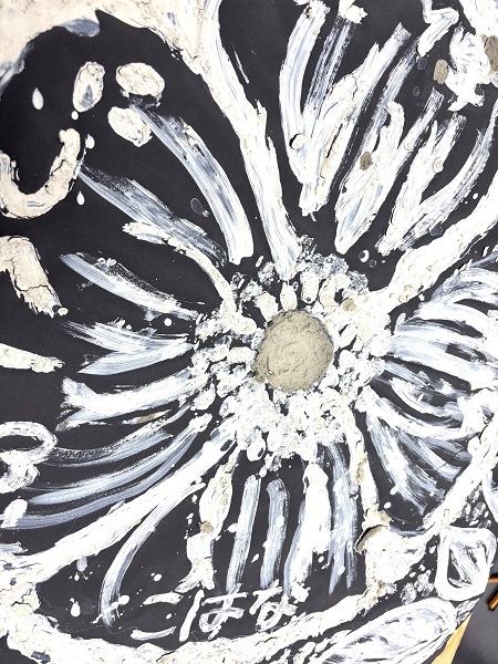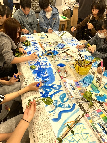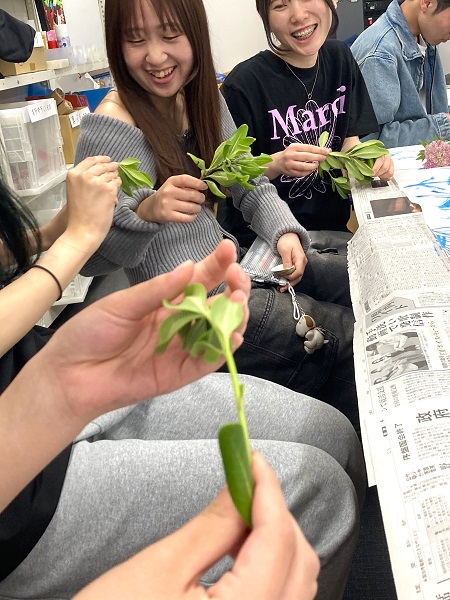 授業のテーマは自然やものとの『出会い』です。学生たちは活動のなかで実際の花や草葉、貝殻をよく観察しました。目を瞑って、手のひらや指で触ってみたり、においをかいでみたり、静かな教室の中でその植物や貝がどんな音を出すのか耳を傾けたりしました。観察して感じたことや発見したことから、複数の方法で造形表現の活動を行いました。複数のグループに分かれ、絵の具を使い筆で描いたり、身体を使って泥で表現したり、紙粘土で立体表現をしたりしました。