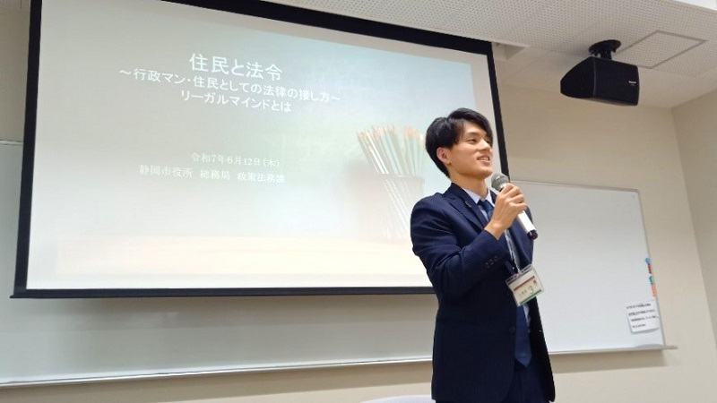 法学部法律学科1年生対象の『地域社会入門』(担当:法学部 丸岡浩三教授)において、静岡市総務局政策法務課の若手職員から『行政マン・住民としての法律の接し方~リーガルマインドとは~』をテーマにお話をいただきました。