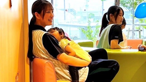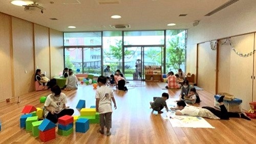 子どもたちは、最初はお母さんやお父さんと離れる場面で緊張した様子も見られましたが、おままごとやブロック遊び、ボール遊びやお絵描きなど、自分の好きな遊びを見つけると次第に夢中になり、笑顔を見せながら学生たちと楽しい時間を過ごしていました。中には、安心して学生の腕の中で眠ってしまう子どもの姿も見られました。