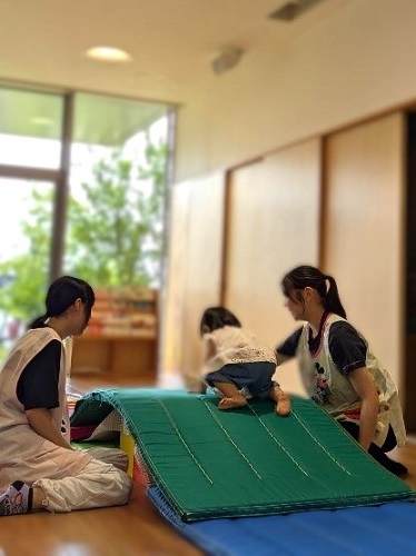 7月5日(土曜日)10時00分から、静岡草薙キャンパス子育て支援室にて『お楽しみ体操』(富田ゼミ)と『お出かけマップづくり』(七星ゼミ)を実施しました。梅雨が明けたばかりの暑い日でしたが、3組のご家族(0歳児1名、1歳児1名、2歳児1名)にご参加いただきました。