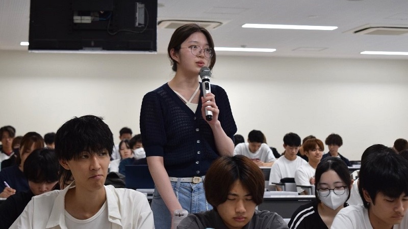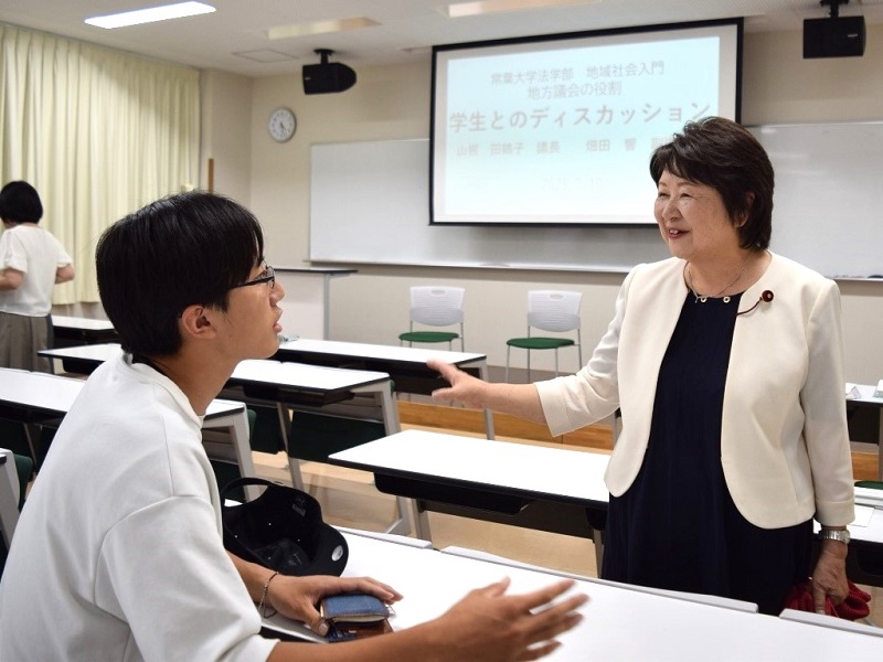 法学部法律学科1年生対象の『地域社会入門(担当:法学部 丸岡浩三教授)』において、静岡市議会の山根田鶴子議長、畑田 響副議長をお招きし、学生と議会の役割や静岡市政などについてのディスカッションを行いました。