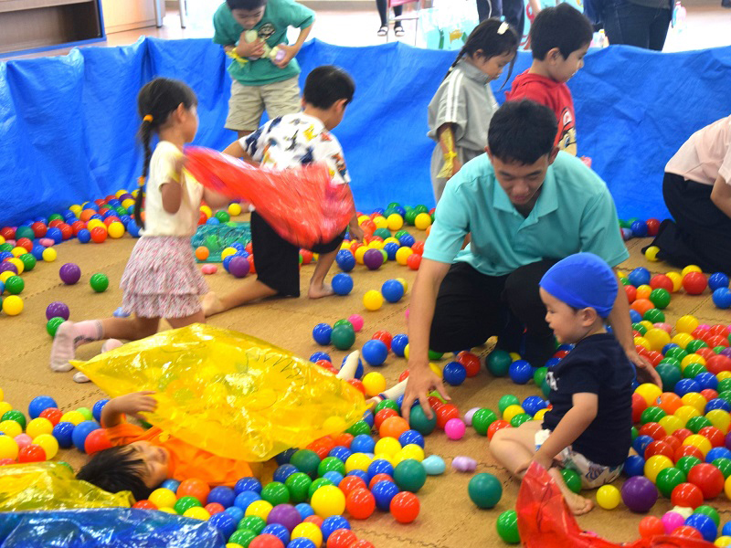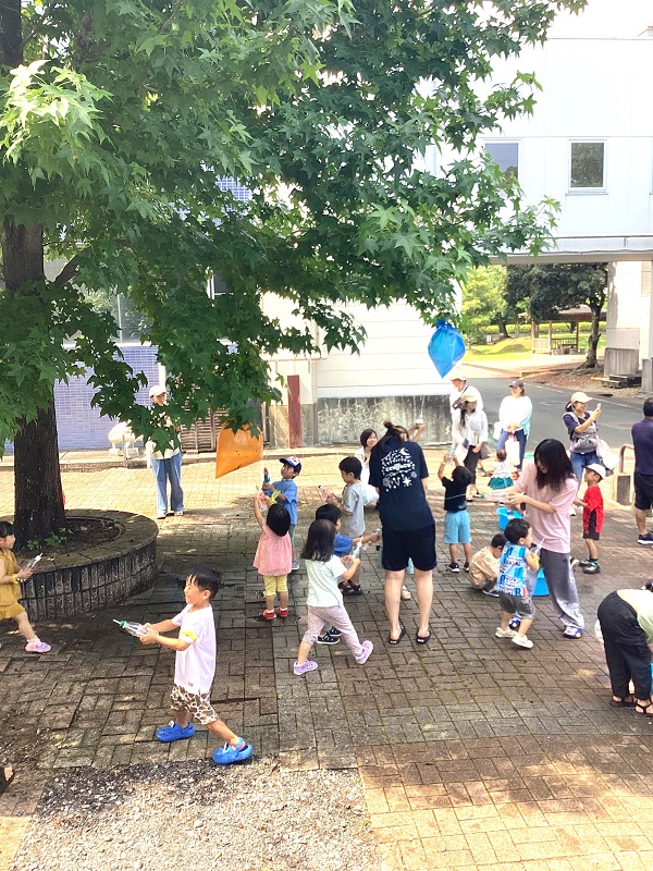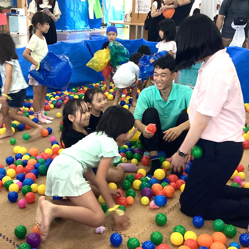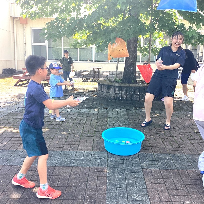 屋外では的を水鉄砲で狙ったり、水をかけ合ったりと、子どもも学生も全身びしょぬれになって楽しみました。水鉄砲は子どもたちが室内で学生と一緒に手作りし、オリジナル水鉄砲に大喜びでした。室内ではボールプールや魚釣り、お魚づくり、ボーリングなどのブースを設け、特に魚釣り体験では、初対面の子どもたちが協力し合う姿が見られました。