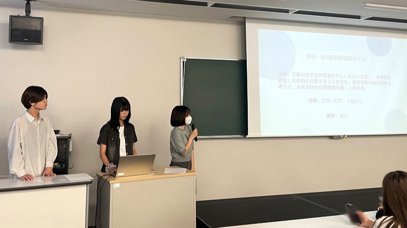 鈴木来奈さん、瀧花唯瑠さん、一圓天舞さんは、静岡市国際交流協会主催の『静岡・釜山新朝鮮通信使友好事業』に参加した経験を報告しました。静岡県内の15名の大学生が選抜され、3回の研修を受けた後、韓国を訪問し、日韓の学生たちが互いに準備をして発表を行ったり、韓国文化体験として伝統衣装を着たりグループに分かれて大学訪問を行ったりしたことが報告されました。韓国学生との交流は言語力向上だけでなく、物事の考え方や捉え方に変化を与えてくれたこと、研修後も互いにやりとりが続いていることなどが語られました。