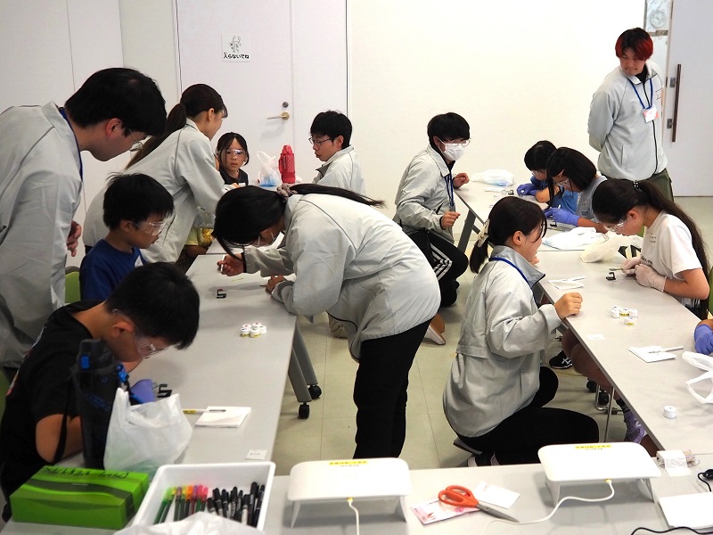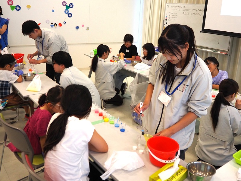 『サイエンスまつり』では、教育学部生や法学部生で構成された理科研究部のメンバーがスタッフとなり、『私だけのオリジナルスライムを作ろう!』『カラフルでキラキラな人工いくらを作ろう!』『磁石の力でネイルアートを楽しもう!』の3ブースを出展しました。