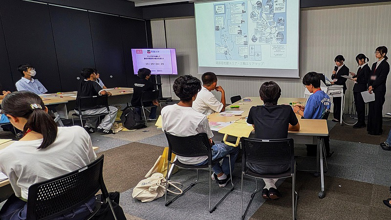受講者には、ゼミ生が制作した岡部町散策マップをさらにカスタマイズしてもらい、岡部町マイマップを発表してもらいました。岡部町近隣に住む高校生から岡部町を訪れたことのない県外の大学生まで、受講者各々が選ぶ岡部町の魅力ポイントの違いも確認でき楽しく有意義な講座となりました。また、担当講座の後には他大学のワークショップ内でファシリテーターも務め、高校生の受講者からの意見を引き出しまとめました。