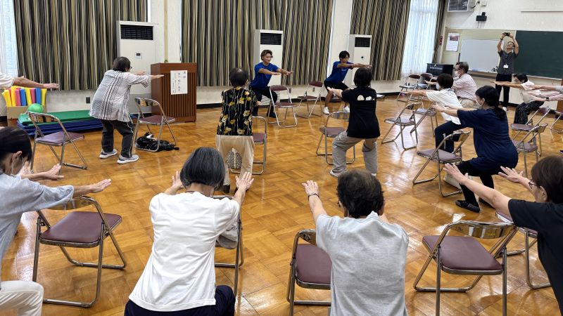 次に行われた実技では、学生が授業(介護予防運動演習)で得た知識と指導スキルを活用し、ロコモティブシンドローム予防のための運動とストレッチを指導しました。