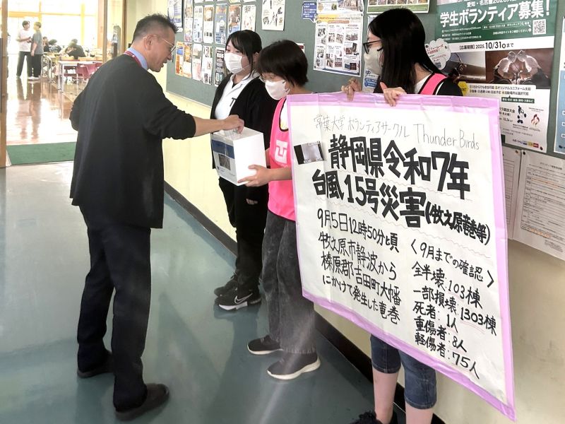 9月5日の台風15号で発生した竜巻等の災害を受け、被災地を支援しようと、浜松キャンパスの学生ボランティアサークルThunderBirdsとハートリンクに所属する学生が、9月25日(木曜日)と26日(金曜日)の昼休み、牧之原市等の被害状況を伝える手作りのパネルを掲げ、食堂や学生ホールを利用する学生に募金の協力を呼びかけました。