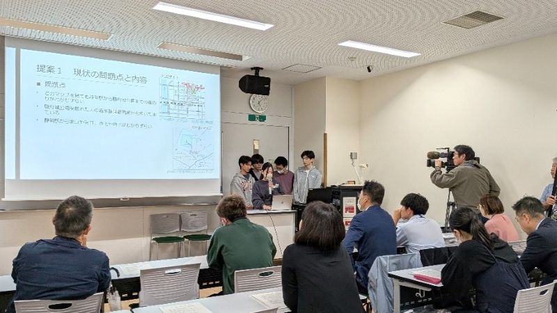 当日は静岡朝日テレビの取材を受け、緊張の中、発表するという素晴らしい機会に恵まれるとともに、関係者だけでなく、テレビ視聴者へも活動を周知することができました。単なる提案ではなく、しずおか中部連携中枢都市圏地域課題解決事業の助成金を活用して学生たちがこれから成果品を製作します。この活動により、駿府城エリアについて関心を持つ人が増え、活性化に少しでもお役に立ちたいと思います。