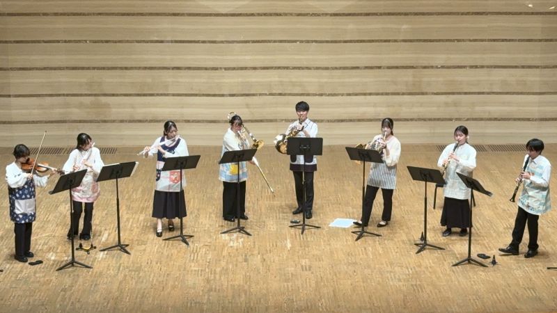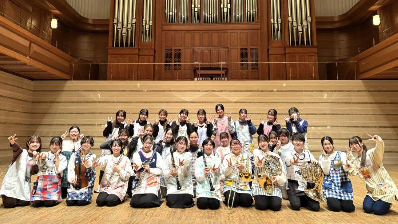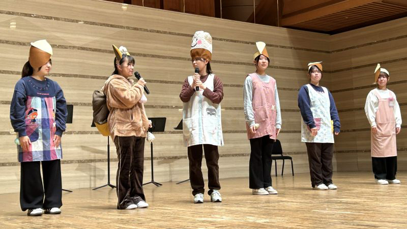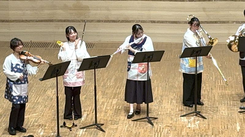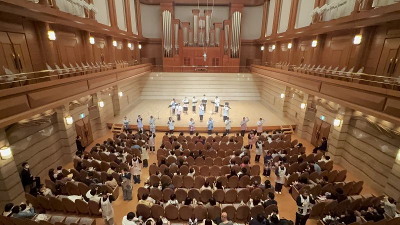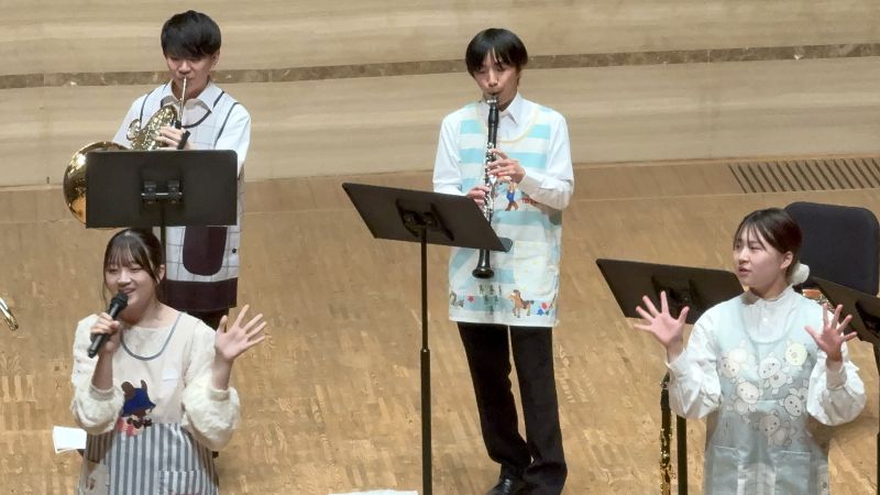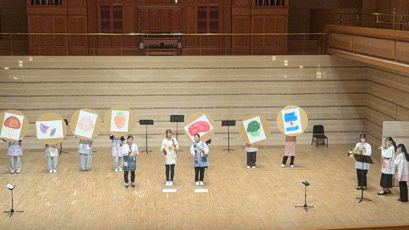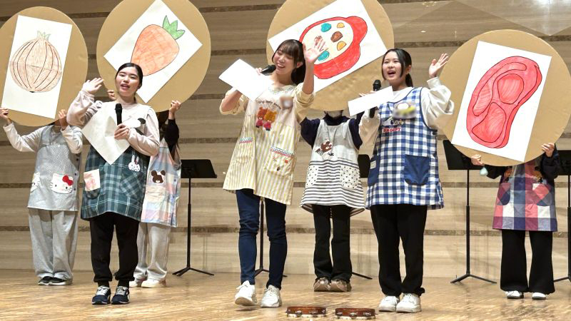 演奏の後半では、音楽科生と保育科生、そして会場とのコラボレーションが行われ、楽曲に合わせて歌ったり手遊びやダンスをするなど、音楽を通してステージと客席が一つになり、皆で表現を楽しむ時間を過ごしました。