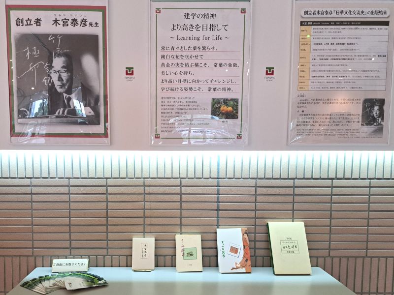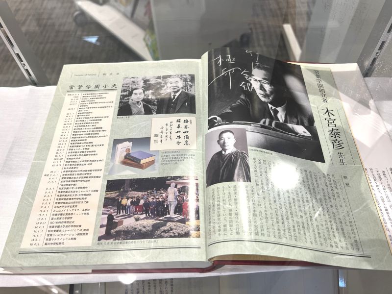 本館入口には、学園創立時の写真や創立者木宮泰彦の業績に関する資料が展示され、通りかかった学生たちが足をとめて眺める姿が見られました。