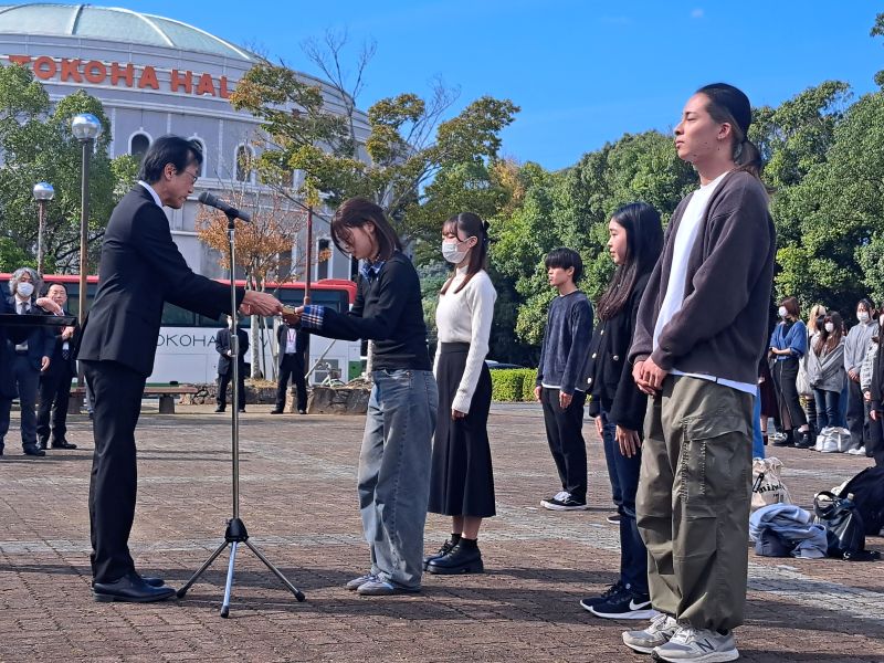 また、10月30日(木曜日)の記念式典では、出口憲副学長による講話の後、『学長奨励賞』の授与と『とこはMIRAIフェロー』の表彰を行いました。今年度、草薙キャンパスでは、学長奨励賞として22名の学生を表彰し、代表して経営学部1年の宮崎恵菜さんに賞状を授与しました。
