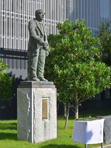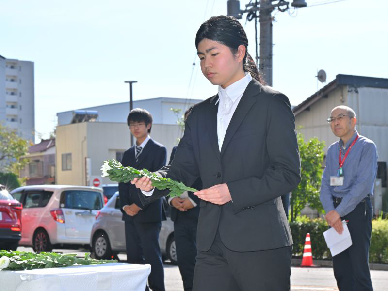 浜松キャンパスでは、創立者木宮泰彦を偲び、けやき広場の銅像に代表者による献花を捧げました。