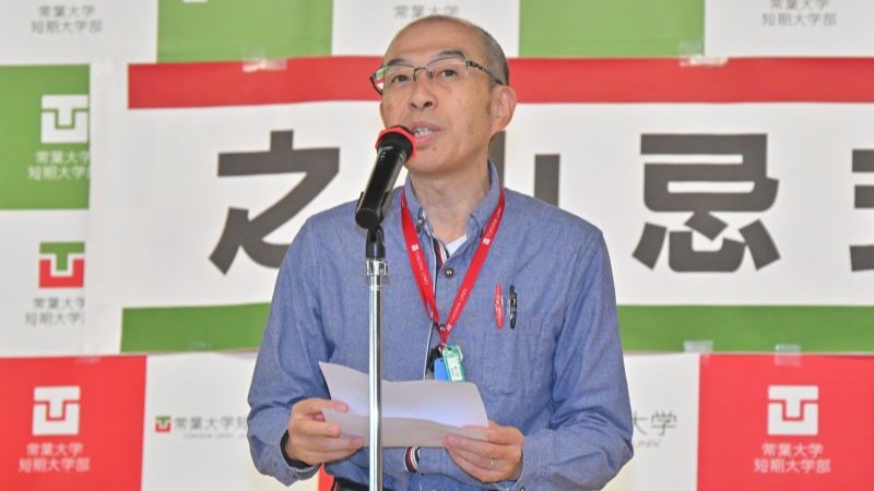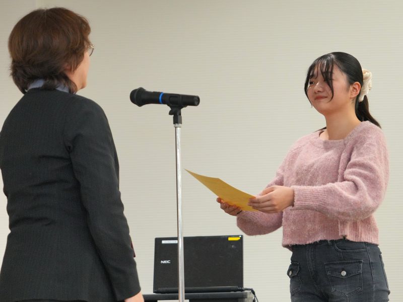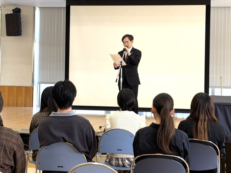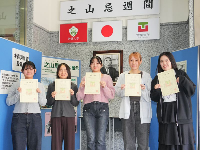 また、創立者の功績や建学の精神を振り返り、常葉大学の生い立ちについての掲示や各種団体が活躍している掲示をしました。式典では、磯貝副学長による講話の後、令和7年度後期学長奨励賞の表彰を行いました。浜松キャンパスでは32名の学生を表彰し、学年の代表者4名に副学長から賞状が授与されました。
