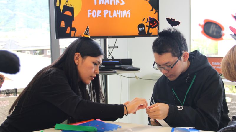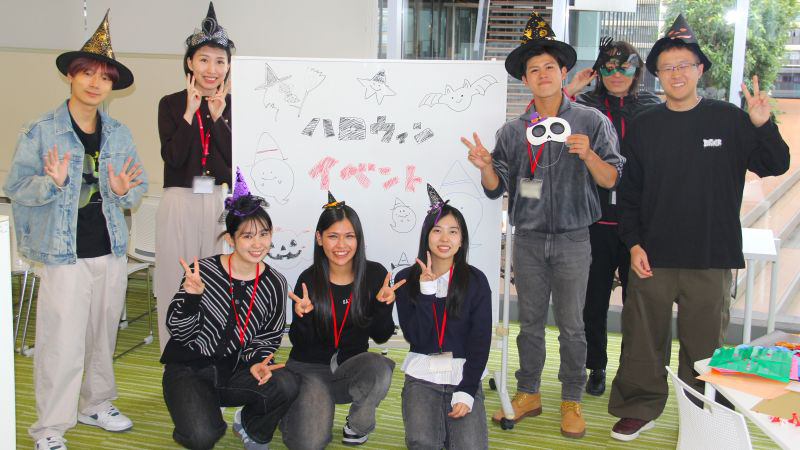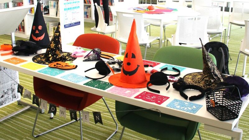 学生ラーニング・アシスタントのアイディアで、イベントでは参加してくれた学生にも仮装グッズを身に着けてもらい、ハロウィンの雰囲気を味わってもらう工夫をしました。