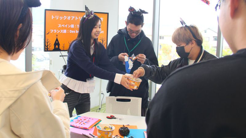 最後は、スペイン語とフランス語で『トリックオアトリート!』を言ってもらい、学生にお菓子をプレゼントしました。