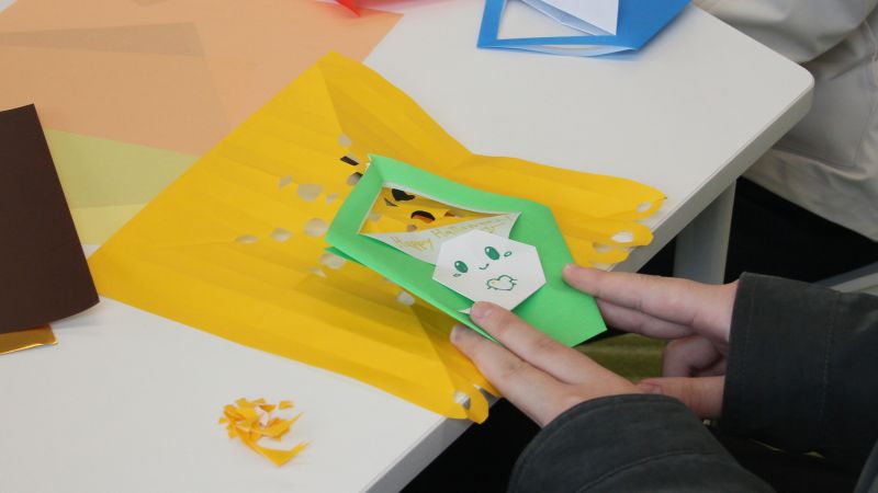 また、参加してくれた学生と一緒に、折り紙を使ってメキシコの民族芸術のパペルピカドと、ハロウィンのお菓子入れを作りました。