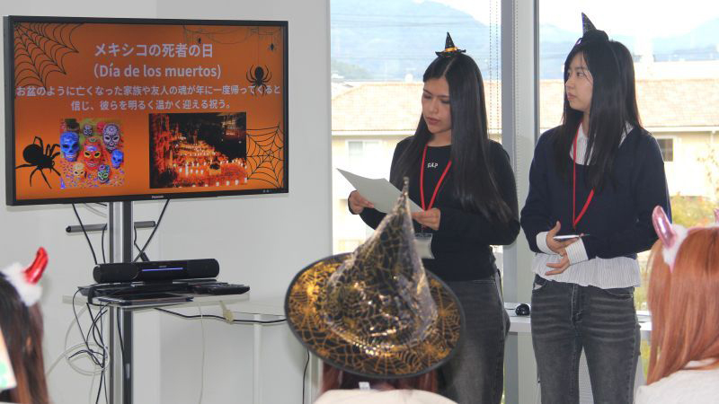 日本でも英語圏のハロウィンはなじみがありますが、今回はメキシコとフランスの秋祭り(ハロウィンに代わる死者の日)について紹介し、参加学生と国際文化理解を深めました。