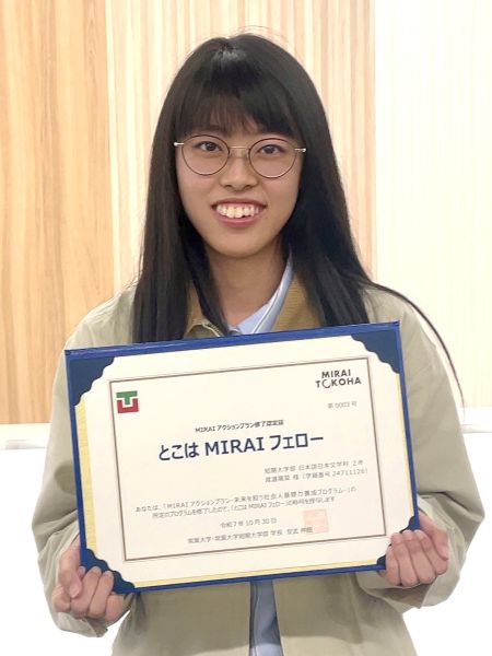 10月30日(木曜日)に本学静岡草薙キャンパスにおいて、とこは未来6プロジェクトの1つである『MIRAIアクションプラン-未来を担う社会人基礎力養成プログラム-』で修了認定者2人に、『とこはMIRAIフェロー』の称号を授与しました。