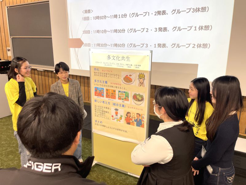 『キャリアアップのための若者オンライン日本語教室』は、浜松市内に在住・在学・在勤する10〜30代(高校生以上)で日本語能力試験<N3>以上の人を対象としたオンライン日本語教室で、7月から11月までのプログラムとして実施されています。すでに9月にも一回目の成果発表会を実施していますが、今回の2回目の発表会に係る授業では、世界各国出身の社会人と常葉大学の学生(外国語学部・経営学部)が相互理解や多文化共生に資する目的で異文化間の合意形成に関するロールプレイを2回と、理想の多文化共生の姿を探るディスカッションを1回行ってきました。その3回の活動の中から、最も興味のあるテーマをそれぞれ選んだ結果、3つのグループに分かれました。そして、その後、各グループが、『自分の国の多文化共生状況、日本が目指す多文化共生の理想の姿』などについてポスターにまとめ、その成果を発表することとなりました。
