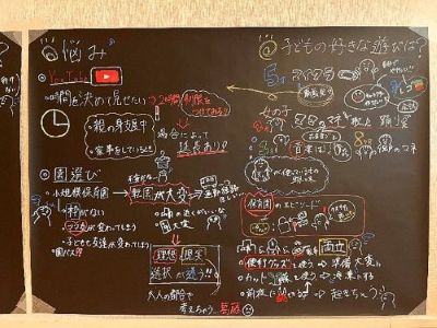 保護者の方には、最近の気になることや悩みなどをきっかけに自由にお話ししてもらい、話した内容を学生スタッフが模造紙にまとめていくセッションを行いました。その後、本日のセッションをまとめをふりかえりながら、保護者同士で話を深めていく場面を設定しました。今回は、夫婦でご参加いただいたご家族も複数おられたため、パパさんグループを作って、パパさんならではのしゃべり場もできました。日々、子育てに奮闘されている保護者のリアルな話を聞くことができることは保育者を目指す学生にとって非常に勉強になります。