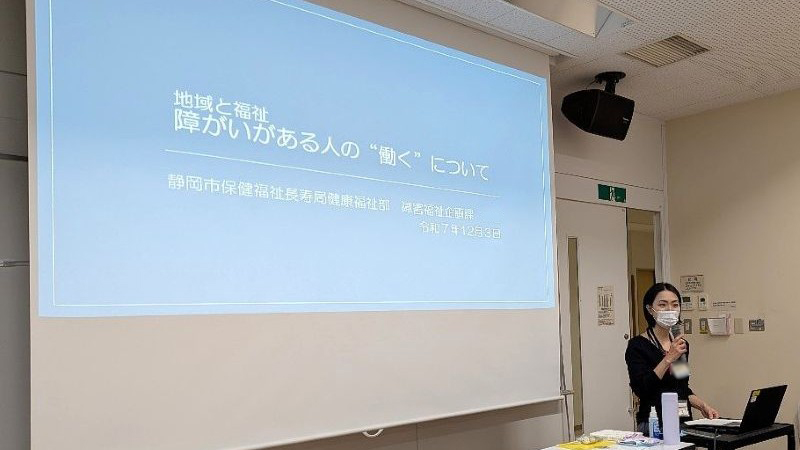 12月3日(水曜日)の『地域と福祉(担当:法学部 丸岡浩三教授)』において、静岡市保健福祉長寿局障害福祉企画課の職員をお招きし、『障がいがある人の“働く”について』と題して、静岡市の障がい者行政の現状等について説明を受けました。